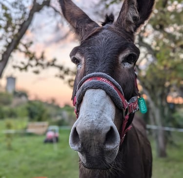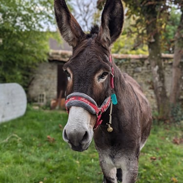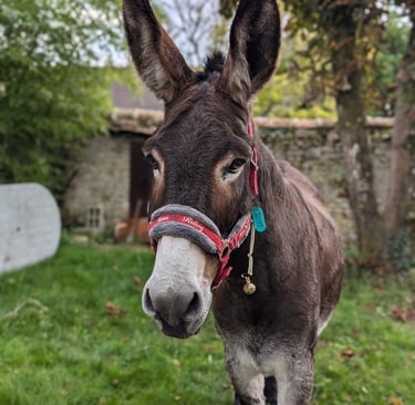 L'âne Zorro et son marcheur ont fait étape au gîte quelques jours. Dégustation de l'herbe bien grasse du jardin au menu !